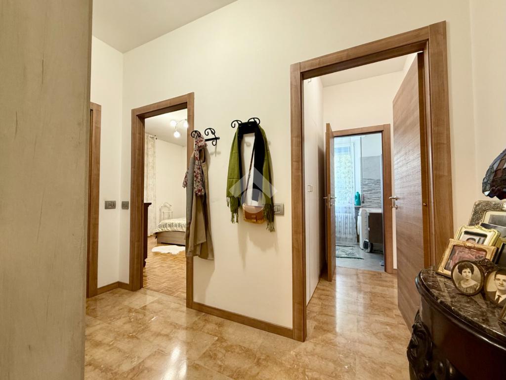 L’ingresso si apre sulla zona giorno luminosa, con la cucina separata e abitabile. Un ampio disimpegno, valorizzato da un armadio a muro, accompagna alla zona notte dove troviamo tre camere da letto e due bagni finestrati. Due delle camere hanno accesso diretto al balcone.