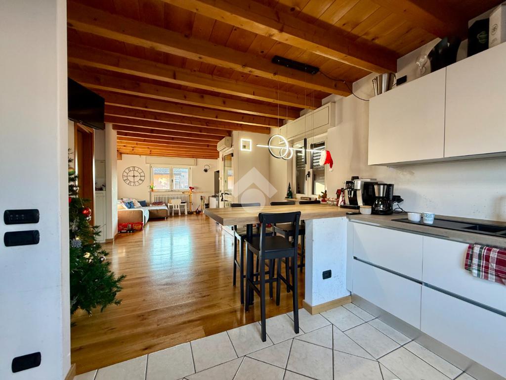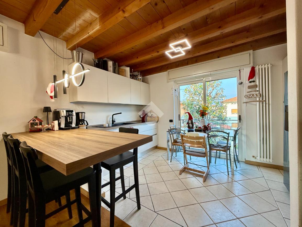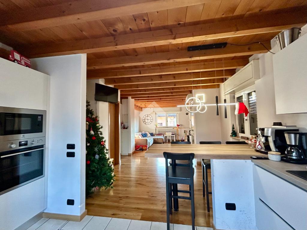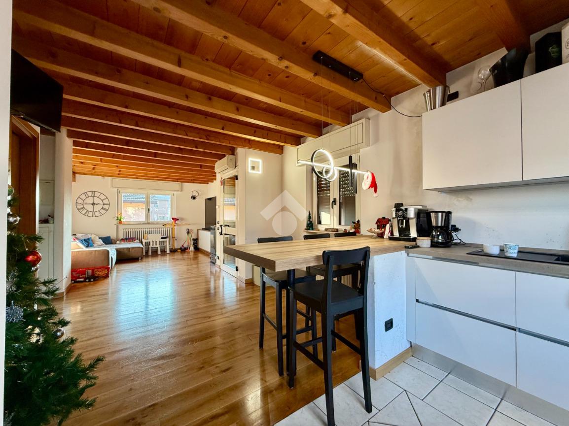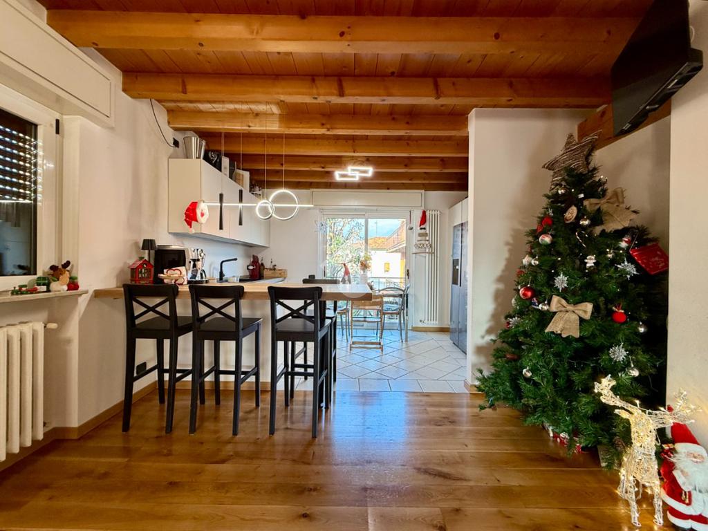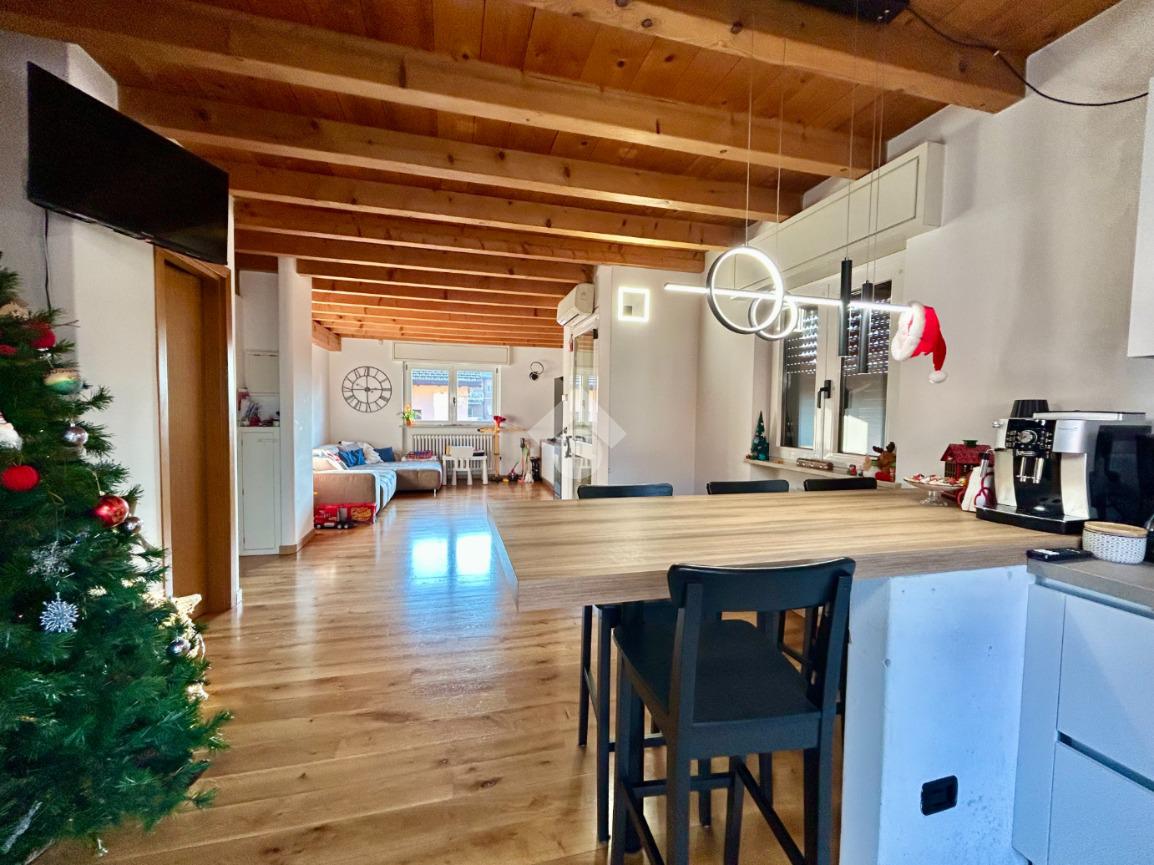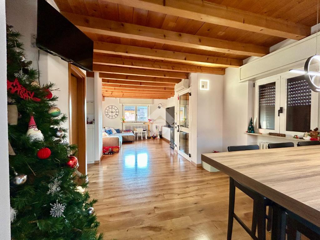 L’accesso all’abitazione avviene tramite scale esterne che conducono all’ingresso principale. La zona giorno si presenta ampia e straordinariamente luminosa, valorizzata da travi a vista e parquet che donano calore ed eleganza agli ambienti. Dal soggiorno si accede al balcone, perfetto come sfogo esterno. Un dettaglio particolarmente pratico e originale è la botola integrata nel muro per il conferimento dei vestiti, che permette di far arrivare direttamente la biancheria nella lavanderia posta al piano seminterrato, semplificando la gestione quotidiana.